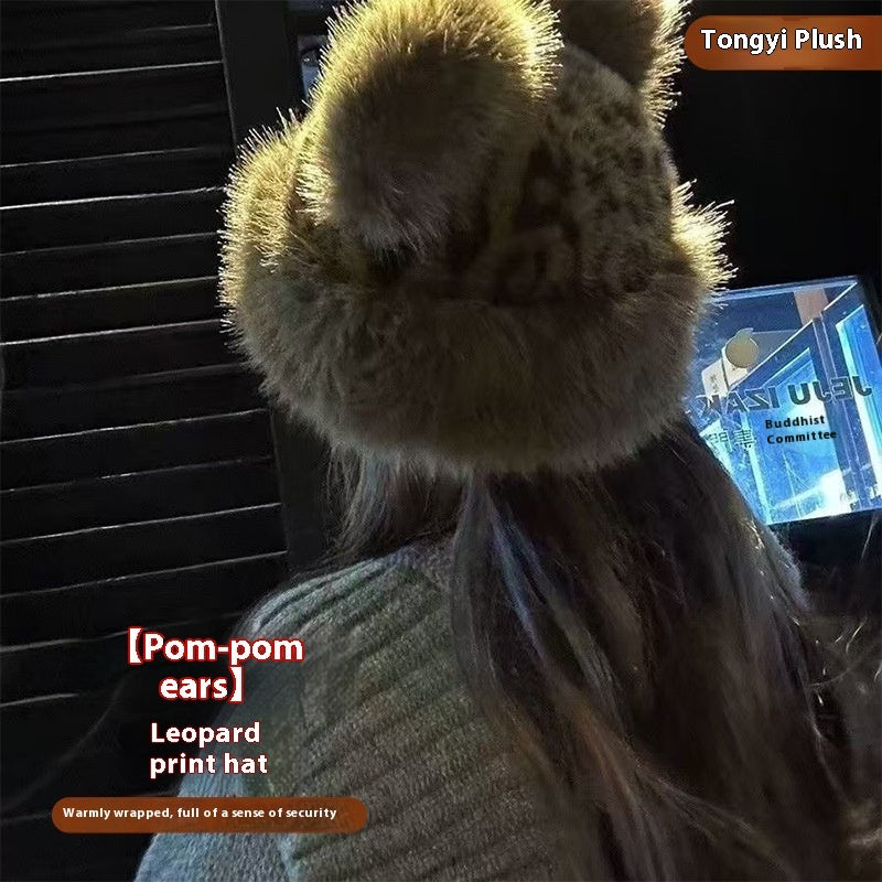 Leopard Pattern Bear Ear Thick Warm Fisherman Bucket Hat